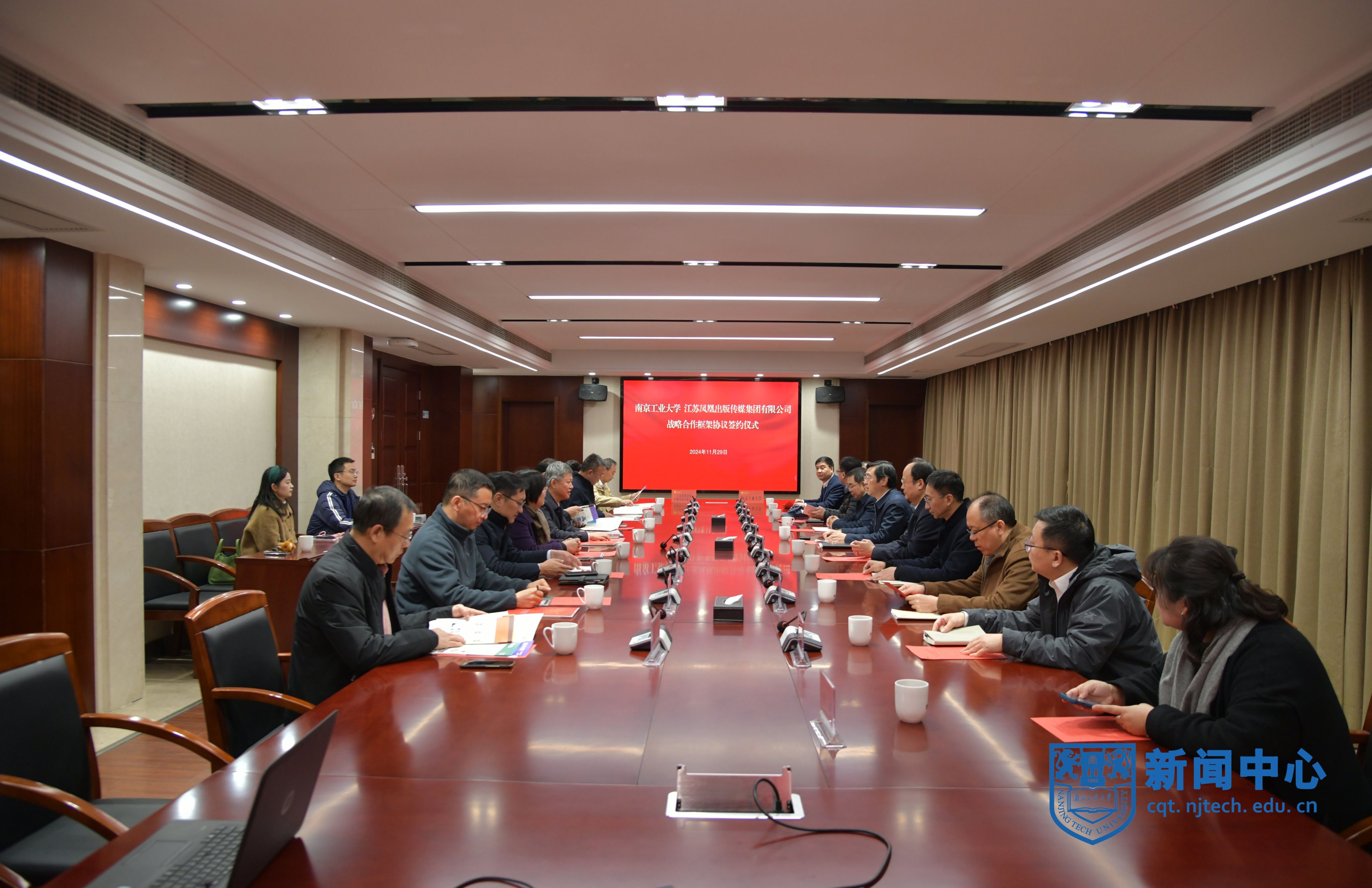 11月29日下午,我校與江蘇鳳凰出版傳媒集團戰略合作框架協議簽約儀式在明正樓104會議室舉行。江蘇鳳凰出版傳媒集團黨委書記、董事長章朝陽,總經理、黨委副書記李貞強,黨委委員、鳳凰傳媒總經理宋吉述,我校黨委書記芮鴻巖,副校長劉大衛出席活動。