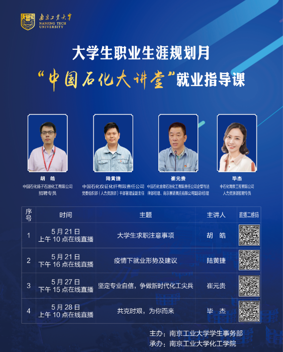 為落實學校黨政主要領導關于做好就業工作的相關指示,有效引導畢業生認清就業形勢、熟悉就業政策、實現精準就業,幫助畢業生了解行業信息、掌握求職技巧,5月21日至5月28日,由學生事務部主辦、化工學院承辦的“中國石化大講堂”成功舉辦。中國石化所屬揚子石化有限公司資深招聘專員胡皓、儀征化纖有限責任公司黨委組織部干部管理室副主任陸黃捷、金陵石化有限責任公司企管與法律部經理崔元貴、南京工程有限公司人力資源部資深招聘專員畢杰等四位老師先后開講,我校相關專業,以及我校參與湖北“一幫一”行動對口高校長江大學工程技術學院等近3000名師生在線參加了講座。